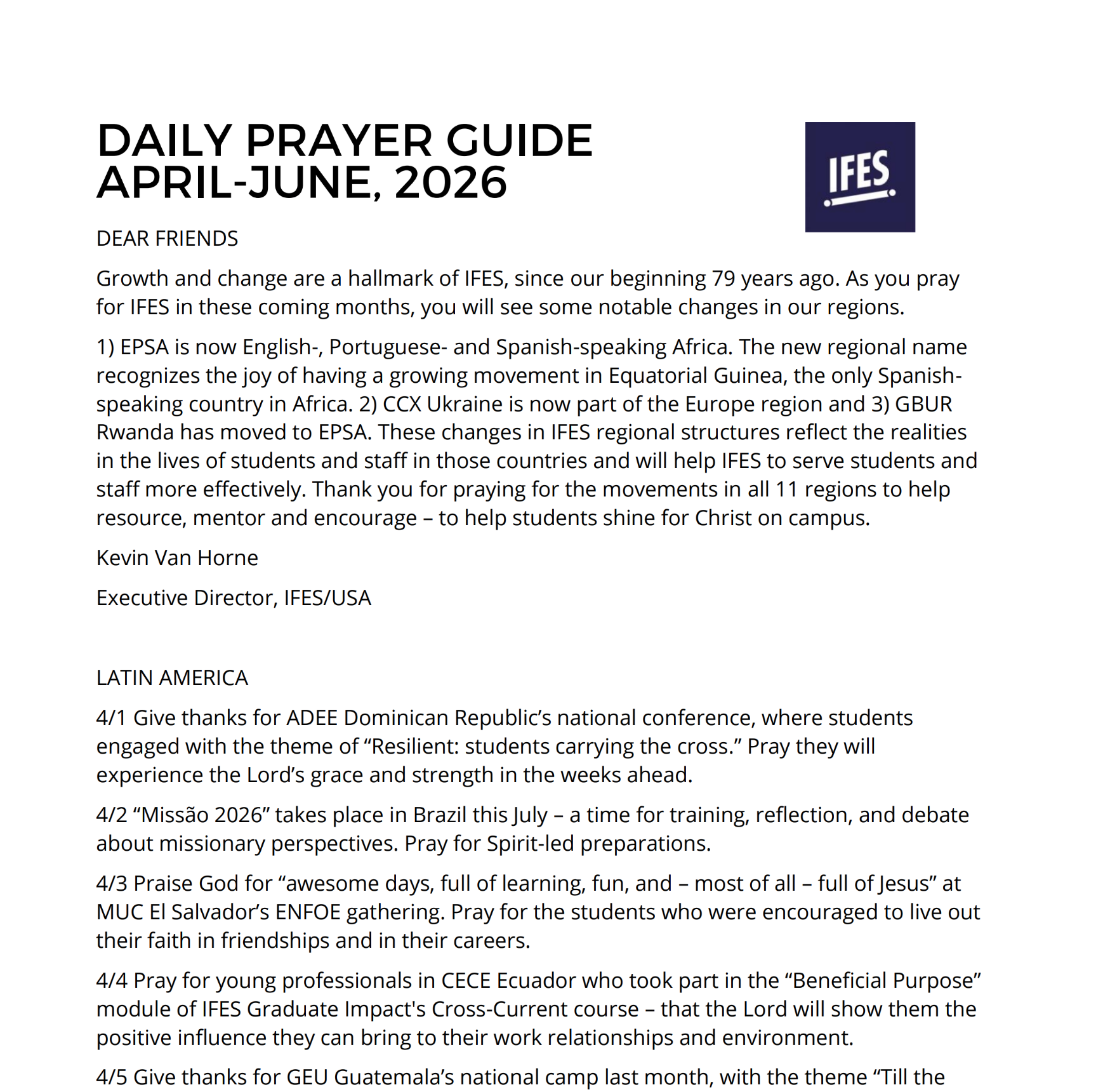 Pray consistently throughout the year by using brief prayer points each day. The guide will take you around all 11 IFES regions every three months.
